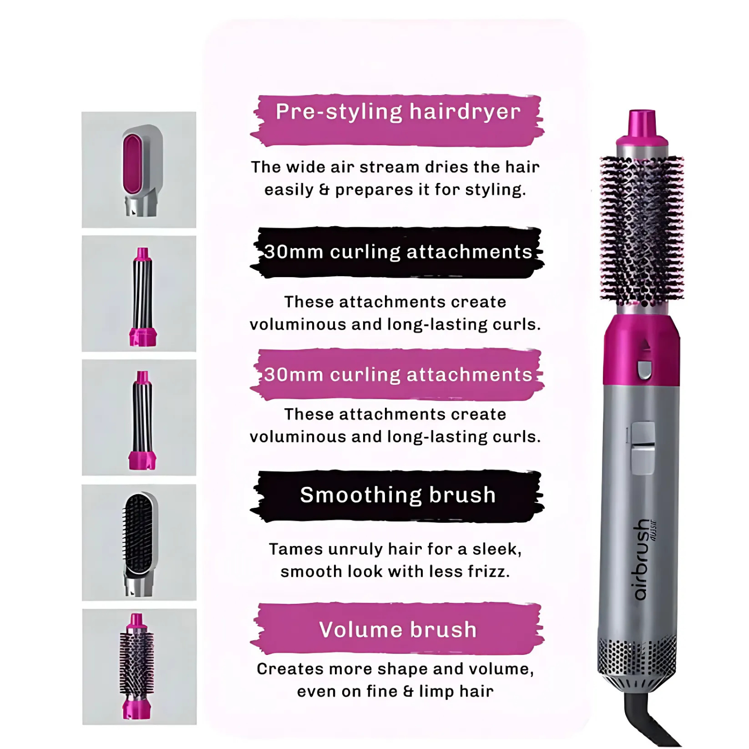 - 5 Versatile Attachments: Curling barrels, volumizing brush, straightening brush, styling comb, and powerful hairdryer.